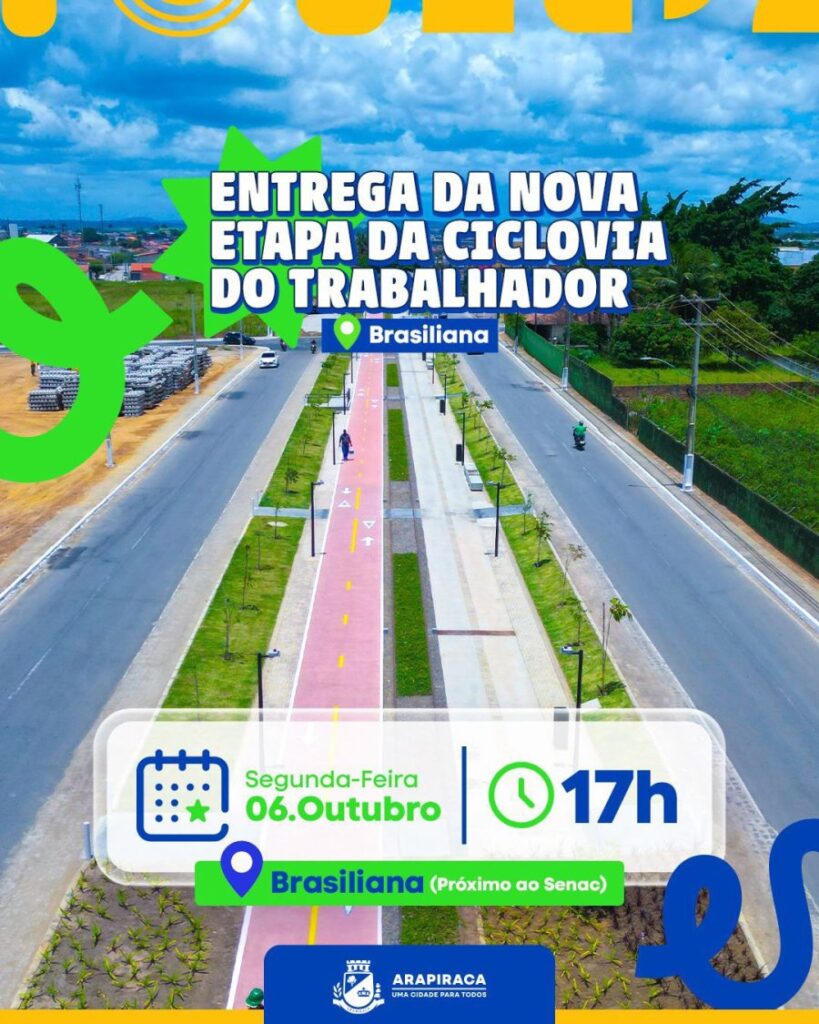 Redação com Assessoria Hoje, segunda feira, dia 06 de outubro, às 17 horas, mais um trecho da Urbanização da Linha Férrea será entregue à população. Dessa vez em frente ao SENAC, no bairro Brasiliana. Com muito trabalho vamos construindo uma Arapiraca para todos. Você é nosso convidado.