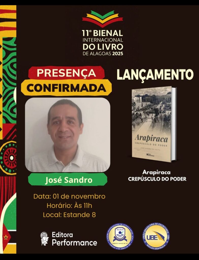O livro Arapiraca-O Crepúsculo do Poder, de autoria do historiador José Sandro da Silva, será lançado no dia 01 de Novembro de 2025, às 11h da manhã, na Bienal Internacional do livro em Maceió. O Arapuraca -O Crepúsculo do Poder, é uma sequência do primeiro livro Arapiraca-Aurora do Poder! Nele, o auto focou nos movimentos […]