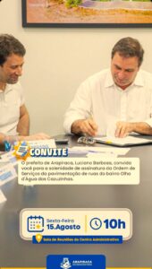Nesta sexta-feira, às 10 horas, na sala de reuniões da Prefeitura, estaremos dando a ordem de serviço para a pavimentação de diversas ruas na comunidade de Olho D’Água dos Cazuzinhas, em Arapiraca.