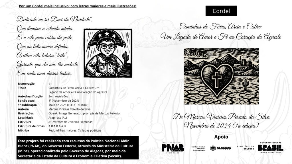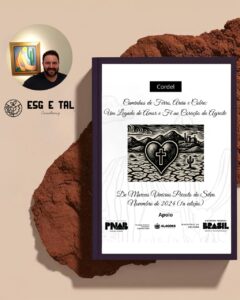 Arapiraca, AL – 02/06/2025 – Após conquistar o 1º lugar regional em Alagoas na categoria “Criação Literária” da Política Nacional Aldir Blanc de Fomento à Cultura (PNAB) – uma iniciativa do Governo Federal por meio do Ministério da Cultura (Minc), e operacionalizada pelo Governo de Alagoas através da Secretaria de Estado da Cultura e Economia Criativa (Secult) –, o fundador e diretor da ESG e Tal, Marcus Vinicius Peixoto da Silva, foi premiado na categoria “Texto Literário” com o cordel Caminhos de Ferro, Areia e Cobre: Um Legado de Amor e Fé no Coração do Agreste.